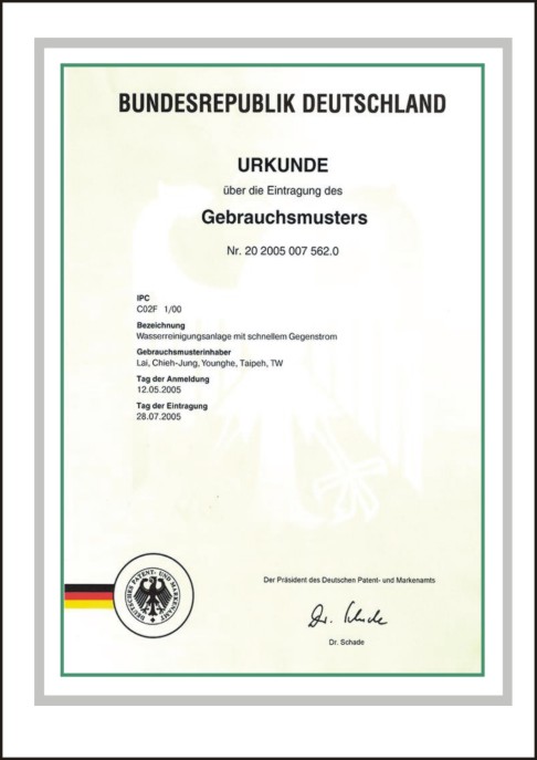 深圳市东方传奇绿能环保科技有限公司产品,DSB-200及DSB-400、101-C系列、101-L系列、101-X系列、101-NA,荣获德国专利证书-快速对洗式水质净化装置